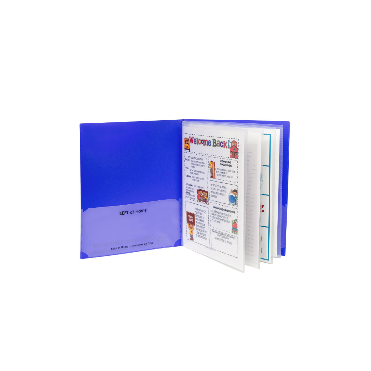 Four document sleeves are located along the middle of the folder. The standard folder pockets are imprinted with 'Home' and 'School' designations, in both English and Spanish. Front and back cover pockets are clear, making them great for custom student cover sheets. Made of durable, acid-free polypropylene. A great place to store classroom contact sheets, monthly lunch schedules and more. Box of 15.