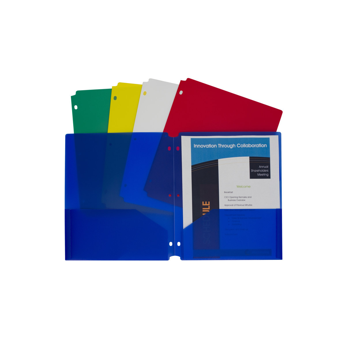 Need some help keeping your three-ring binder in order? With the help of these specialty two-pocket folders, letter-size papers can stay organized, while still remaining accessible. Two-pocket heavyweight polypropylene portfolios / folders with three-hole punch hold papers and resist tearing. Features three-hole punching for secure storage in standard 3-ring binders. Cut-outs at the top and bottom keep portfolio from being caught in binder open-close mechanism. Assortment includes 2 each of red, yellow, green, blue and white folders. Pack of 10.