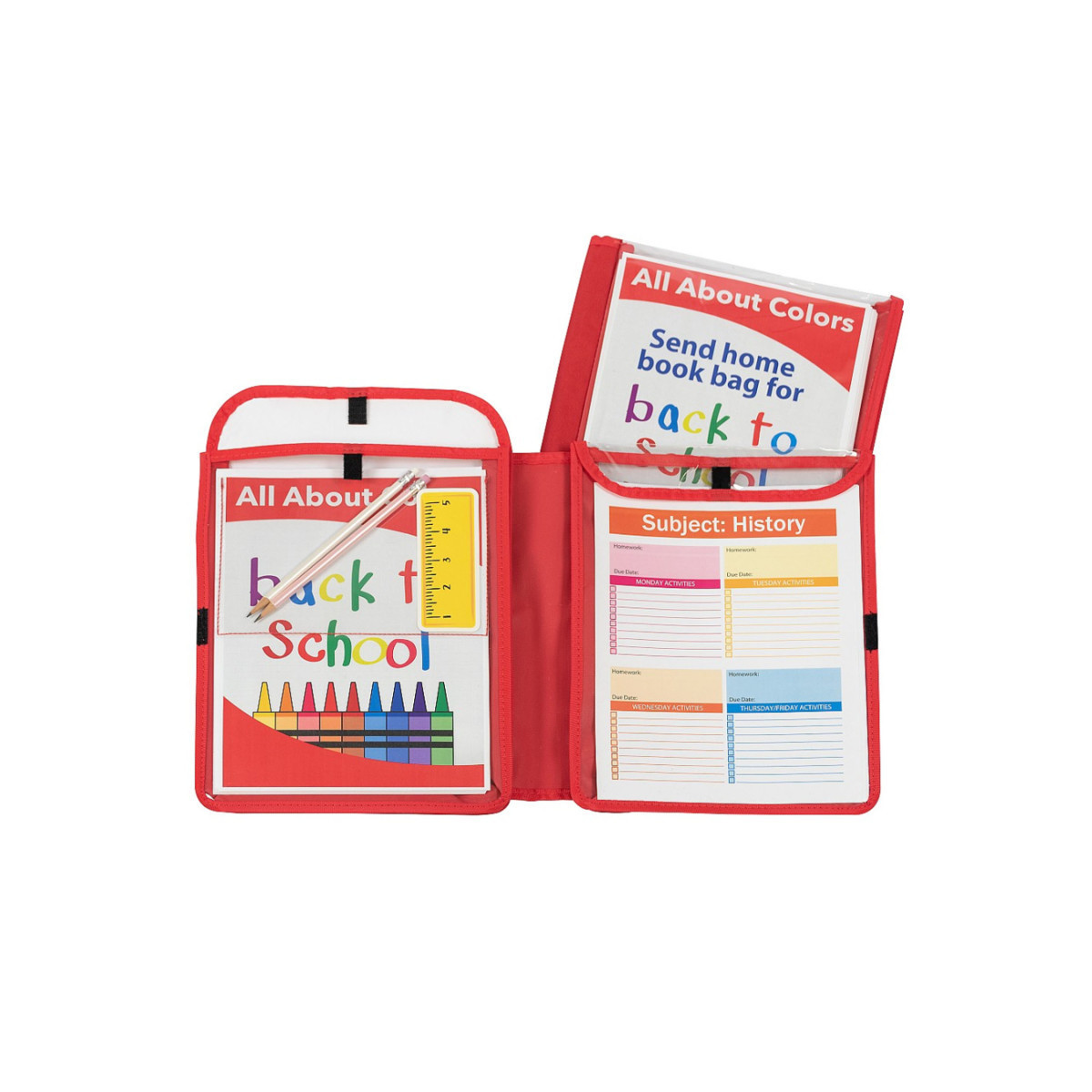 Transport workbooks and homework between school and home in these super heavyweight vinyl folders. Each folder has two clear pockets with a colorful 1 inch fabric gusset that can store workbooks up to 9 x 12 x 1. Holds up to 225 sheets of paper in each pocket. Reinforced stitched edging provides added durability and extends the lifespan of the folder. Interior pockets are sealed with a hook and loop closure for extra protection. Red.