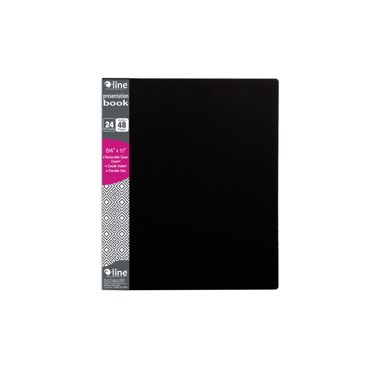 Present your report, project or artwork in style with this presentation book. Features twenty-four bound-in clear top-loading polypropylene sheet protectors that lie flat while the book is open. Storage pocket on inside front cover holds extra materials. Clear-view spine insert is reversible for instant customization. Acid-free. Black.