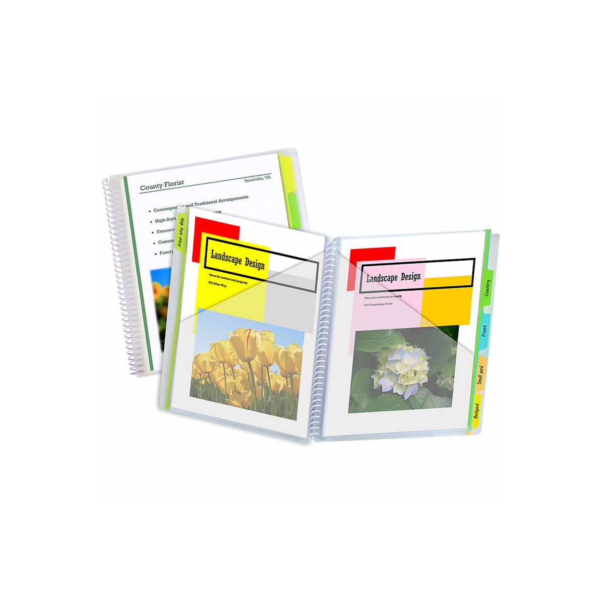 This spiral-bound organization product stores notes and documents in a protective holder. Suitable for both students and professionals, the sleek outer cover provides a stylish appearance to the portfolio. Organize projects, subjects, notes and more in one convenient place. Ten interior pockets allow for detailed organization. Write-on tabs make for quick and easy custom organization; works with pencil, ball point pen or permanent marker. Spiral-bound portfolio features clear-view front pocket for cover sheet. Made of heavyweight acid-free polypropylene. For letter size documents. Clear cover and pockets with assorted color tabs. Includes 1 portfolio.