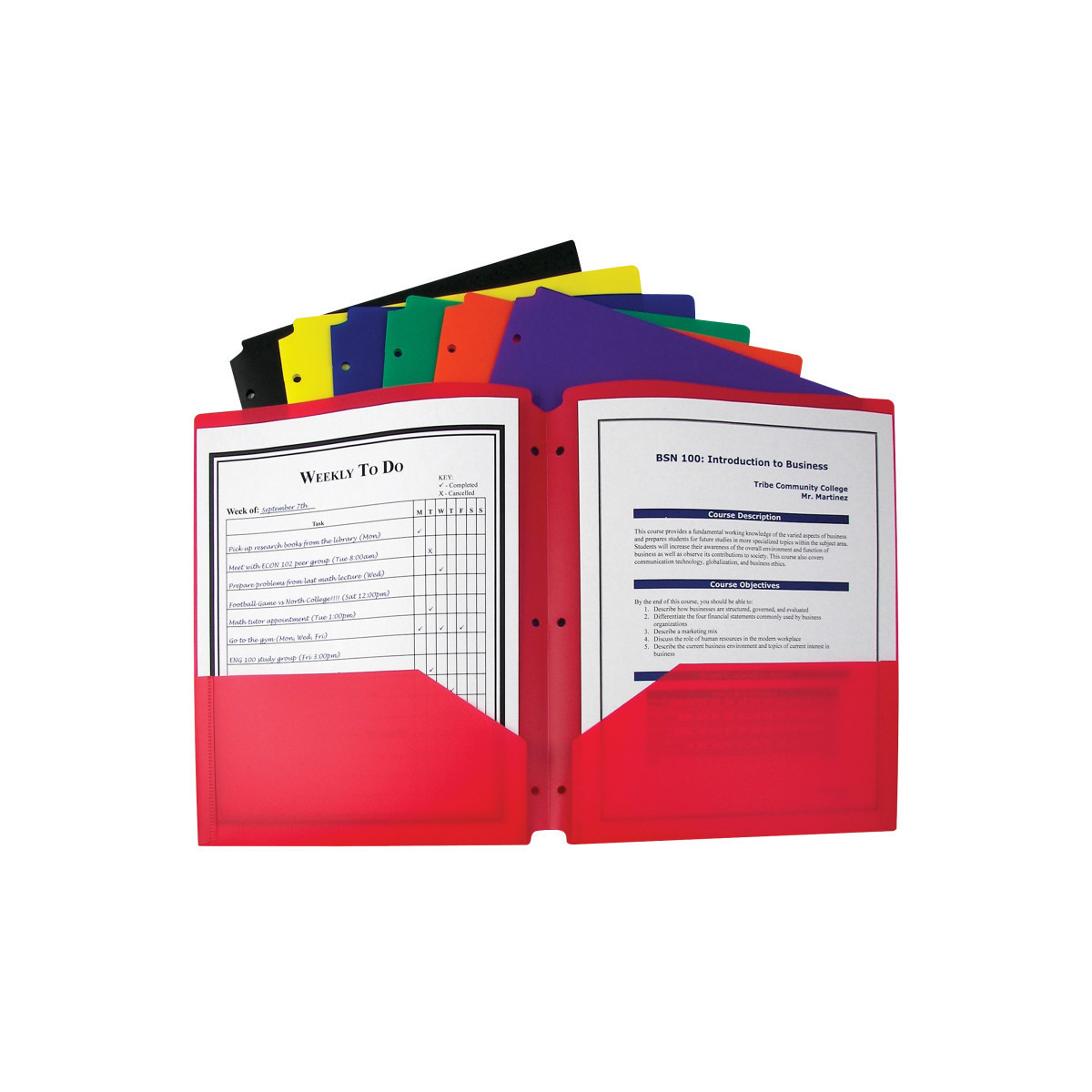 Need some help keeping your three-ring binder in order? With these specialty two-pocket folders, letter-size papers can stay organized, while still remaining accessible. Two-pocket heavyweight polypropylene portfolios/folders hold papers and resist tearing. Features three-hole punching for secure storage in standard 3-ring binders. Cut-outs at the top and bottom keep portfolio from being caught in binder open-close mechanism. Assorted primary colors include red, orange, yellow, green, blue, purple and black. Includes 36 folders.
