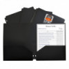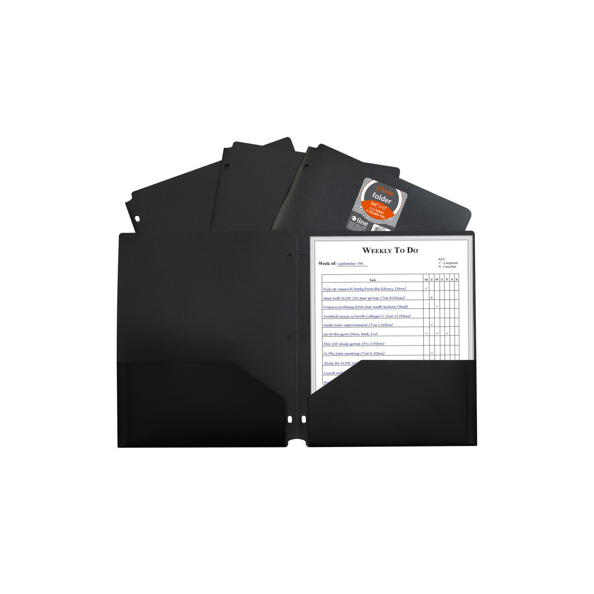 Need some help keeping your three-ring binder in order? With the help of these specialty two-pocket folders, letter-size papers can stay organized, while still remaining accessible. Two-pocket heavyweight polypropylene portfolios/folders with three-hole punch hold papers and resist tearing. Features three-hole punching for secure storage in standard 3-ring binders. Cut-outs at the top and bottom keep portfolio from being caught in binder open-close mechanism. Black. Sold individually.