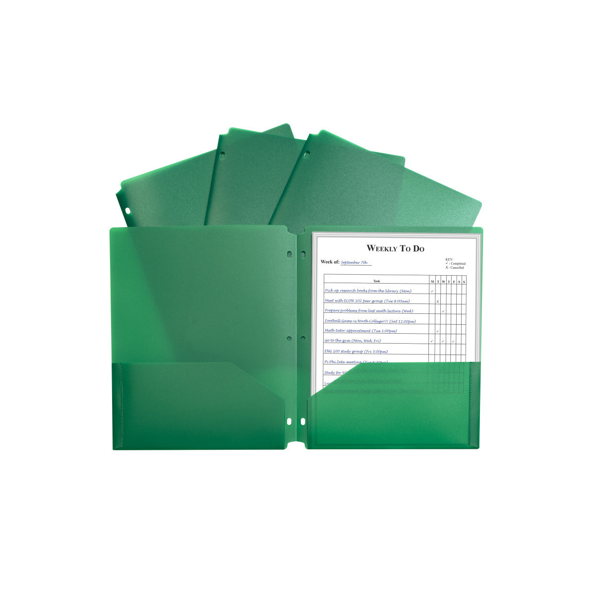 Need some help keeping your three-ring binder in order? With the help of these specialty two-pocket folders, letter-size papers can stay organized, while still remaining accessible. Two-pocket heavyweight polypropylene portfolios/folders with three-hole punch hold papers and resist tearing. Features three-hole punching for secure storage in standard 3-ring binders. Cut-outs at the top and bottom keep portfolio from being caught in binder open-close mechanism. Green. Sold individually.