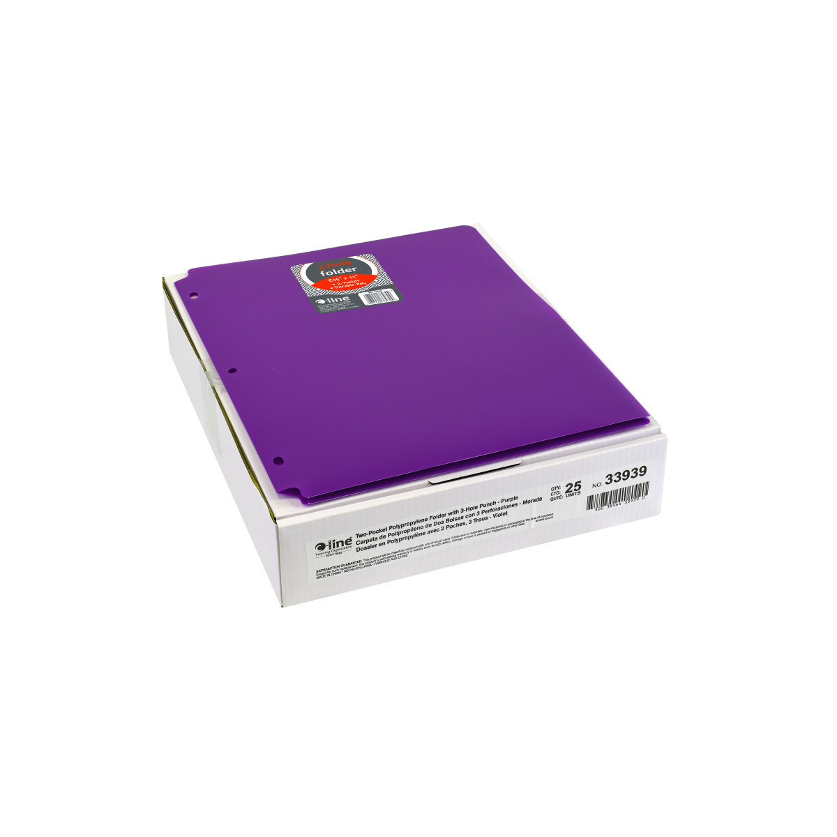 Need some help keeping your three-ring binder in order? With the help of these specialty two-pocket folders, letter-size papers can stay organized, while still remaining accessible. Two-pocket heavyweight polypropylene portfolios/folders with three-hole punch hold papers and resist tearing. Features three-hole punching for secure storage in standard 3-ring binders. Cut-outs at the top and bottom keep portfolio from being caught in binder open-close mechanism. Purple. Sold as a pack of 25 folders.