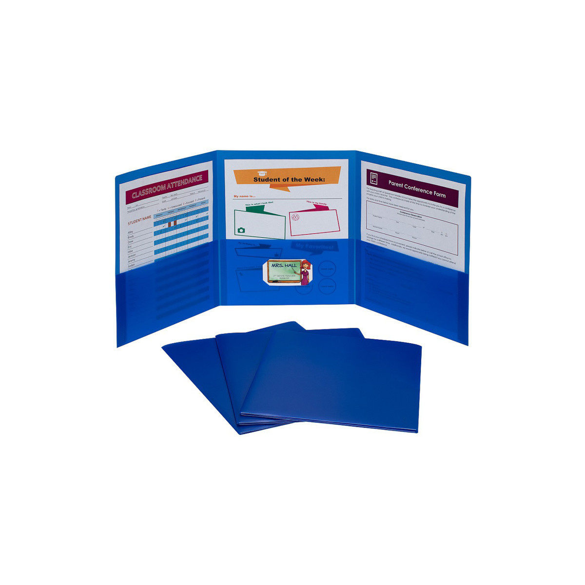 Ideal for classroom and office settings, this three-pocket folder is an essential presentation and letter-size document storage item. Made from heavyweight polypropylene material, the portfolio is the same size as a two-pocket folder when folded up. Simply pull back the front flap and the inside flap to expose all three, top-loading pockets. There is a business card holder located on the middle pocket, making it possible to personalize client presentations or class reports. Blue, box of 24.