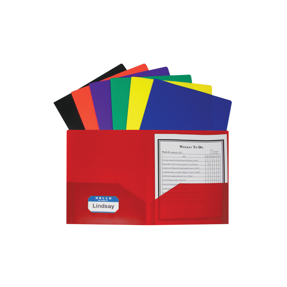 Two-pocket heavyweight polypropylene portfolios/folders hold papers and resist tearing. Features business card slot. Without prongs. Includes 36 folders in assorted primary colors: red, orange, yellow, green, blue, purple and black.