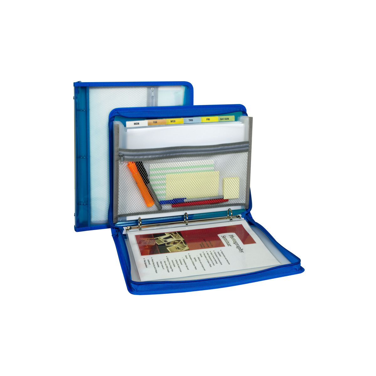 Protecting documents when moving between classrooms or boardrooms can be difficult, but not impossible. The Zippered Binder with Expanding File not only protects 8-1/2 x 11 size documents, but it also keeps paperwork organized. Featuring a 3-ring binder, 7- pocket expanding file and zippered pouch, this versatile file stores a variety of objects. The ring binder stores letter-size documents that are hole punched or placed inside a sheet protector. Featuring seven pockets and six dividers, use the pre-printed tab inserts to identify where pages are stored inside the expanding file. The mesh pencil pouch is perfect for small objects such as pens, pencils, paper clips and more. For added security, the entire file is protected with a zipper closure. Blue.
