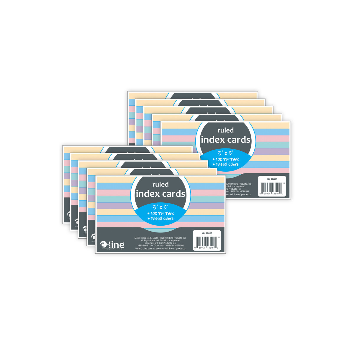 Color code your notes and lists and keep them organized. These colored index cards are a must have for Back-to-School. Cards are lined on the front and blank on the back. Colored index cards are great for flash cards, recipes, to-do lists and more! Perfect for home, school, and business. Each pack contains 100 cards in assorted pastel colors: yellow, green, pink, blue, and purple. Sold as 10 packs for a total of 1000 index cards.