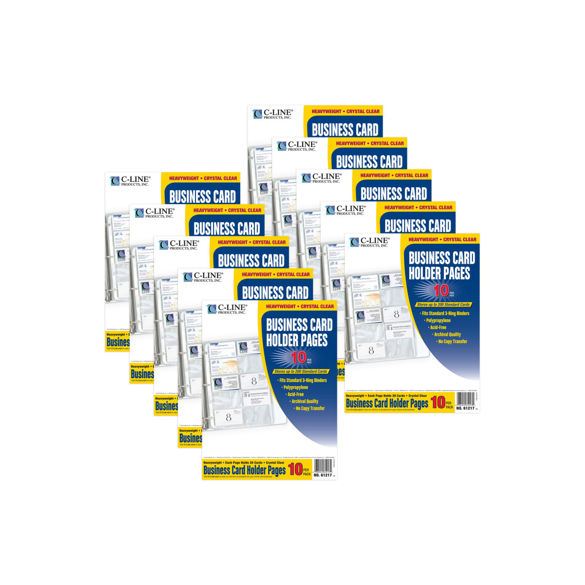 Make finding business cards quick and easy; keep contact information easily accessible. Heavyweight polypropylene with a reinforced binding edge hold your important business cards for easy reference while at the office or on the road. Also available with tabs - see item 61117. Stores 20 business cards per page. Fits standard 3-ring binders. Each pack includes 10 pages business card holders. Sold as 10 packs for a total of 100 business card holder pages.
