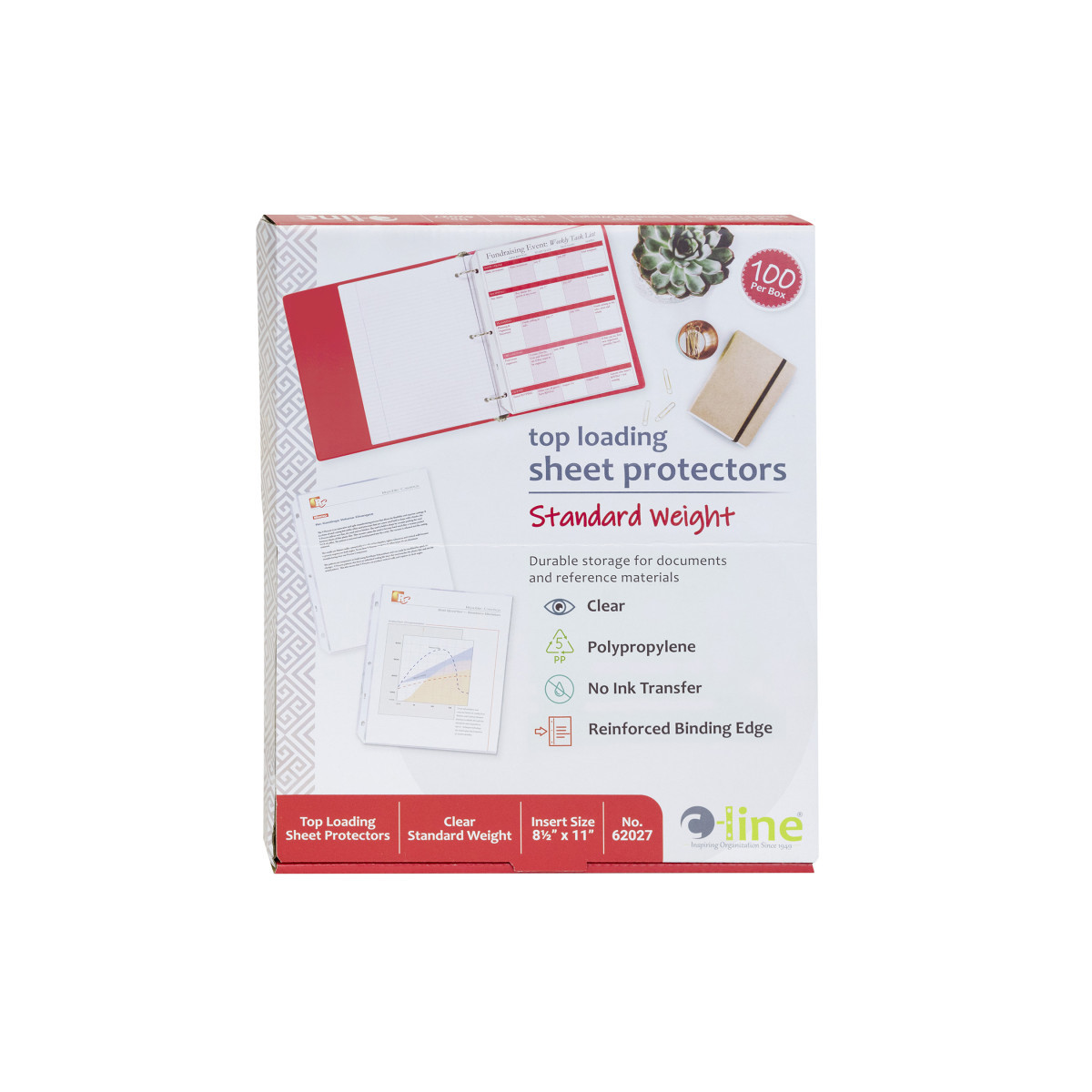 Balance economy and function with these standard weight sheet protectors. Standard weight polypropylene means durable storage for documents and reference materials. Acid-free protection with polypropylene means no photocopy transfer. Top loading sheet protectors provides permanent storage for your materials. No sheet punching is necessary thereby keeping your documents in their original condition. Clear finish. Measures 11" x 8 1/2". Box of 100.