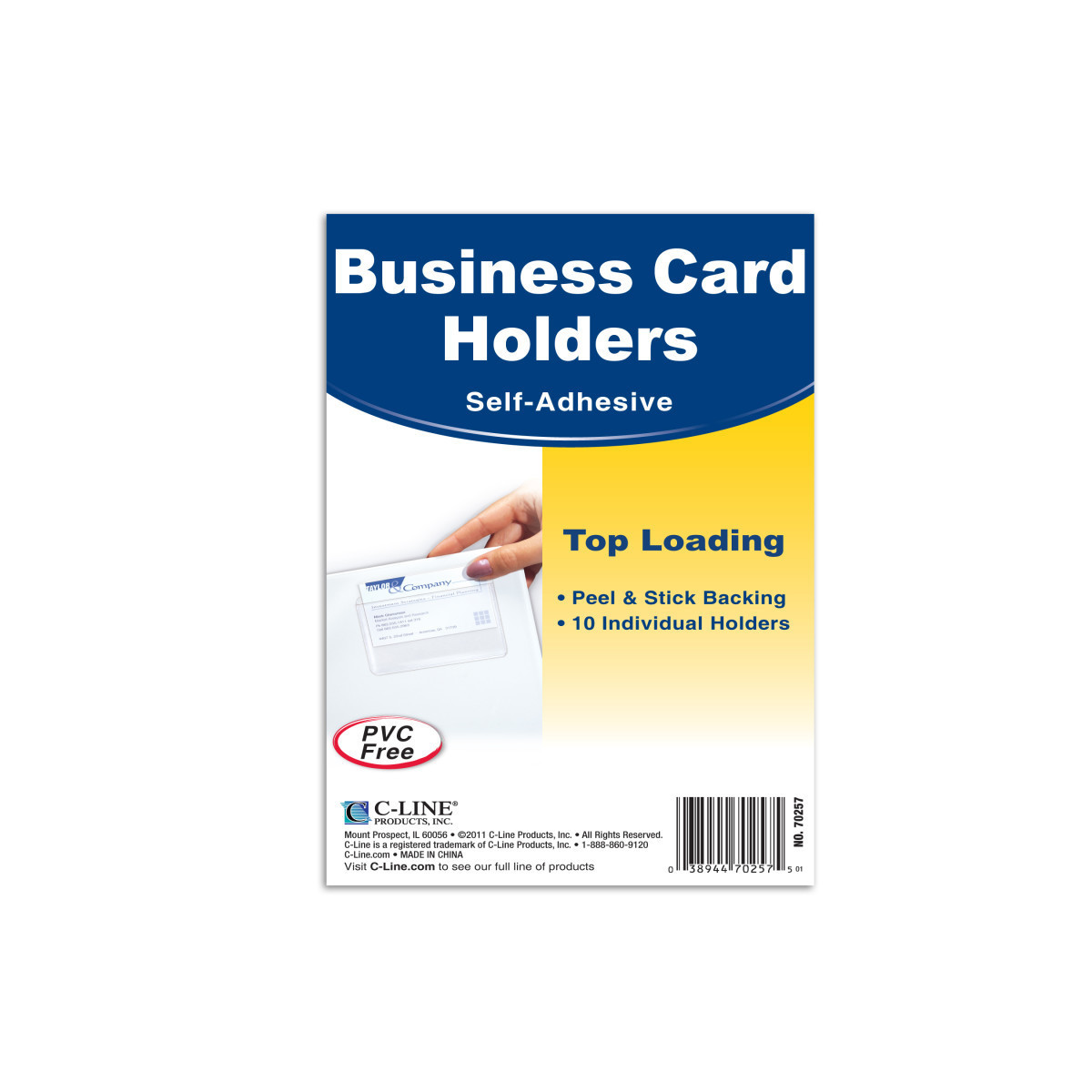 Perfect for office or industrial use, these self-adhesive PVC-free poly holders stick wherever they are needed. Available in a top loading design, the business card holder has the ability to personalize catalogs or handouts provided to customers by storing contact information directly on it. The holder fits standard size business cards and can be secured to an item by using its self-adhesive backing. Pack of 10.