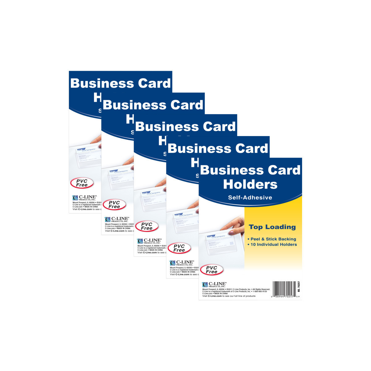 Perfect for office or industrial use, these self-adhesive PVC-free poly holders stick wherever they are needed. Available in a top loading design, the business card holder has the ability to personalize catalogs or handouts provided to customers by storing contact information directly on it. The holder fits standard size business cards and can be secured to an item by using its self-adhesive backing. Measures 2" x 3-1/2". Each pack includes 10 card holders. Sold as 5 packs for a total of 50 card holders.