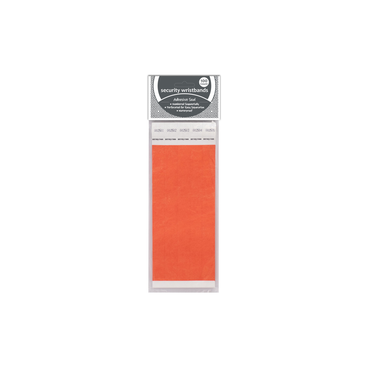 Security wristbands, made with DuPont™ Tyvek®, are an economical solution to visitor and crowd control. The single-use, waterproof wristbands are great for parties, events, field trips or tagging inventory and supplies. Bands are sequentially numbered (choice of starting number not available). To use, peel-off adhesive liner, wrap around wrist and adhere to other side of wristband. 3/4 wide x 10 long.