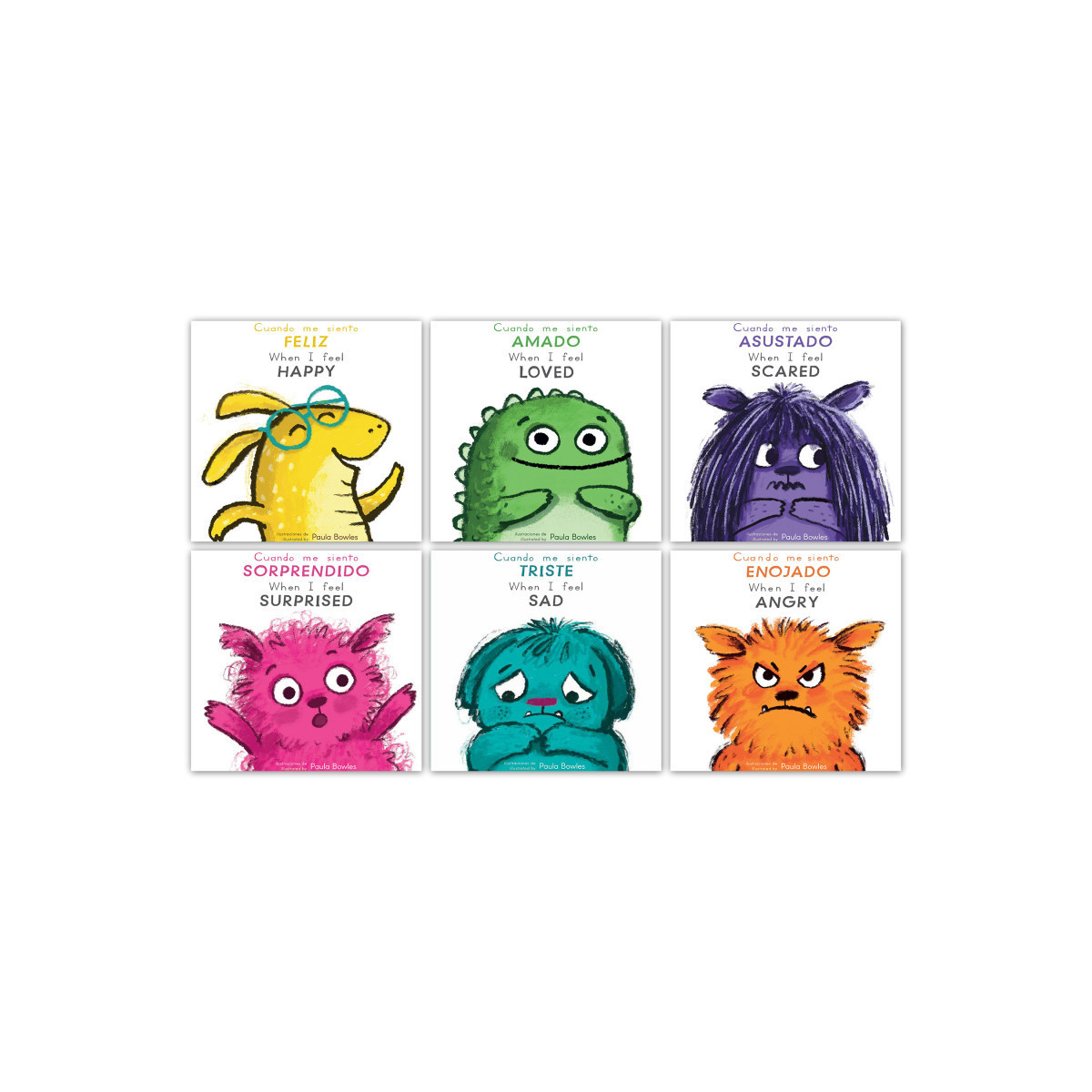 Set of 6 books: Cuando me Siento Enojado/When I Feel Angry, Cuando me Siento Feliz/When I Feel Happy, Cuando me Siento Amado/When I Feel Loved, Cuando me Siento Triste/When I Feel Sad, Cuando me Siento Austado/When I Feel Scared, and Cuando me Siento Sorprendido/When I Feel Surprised.