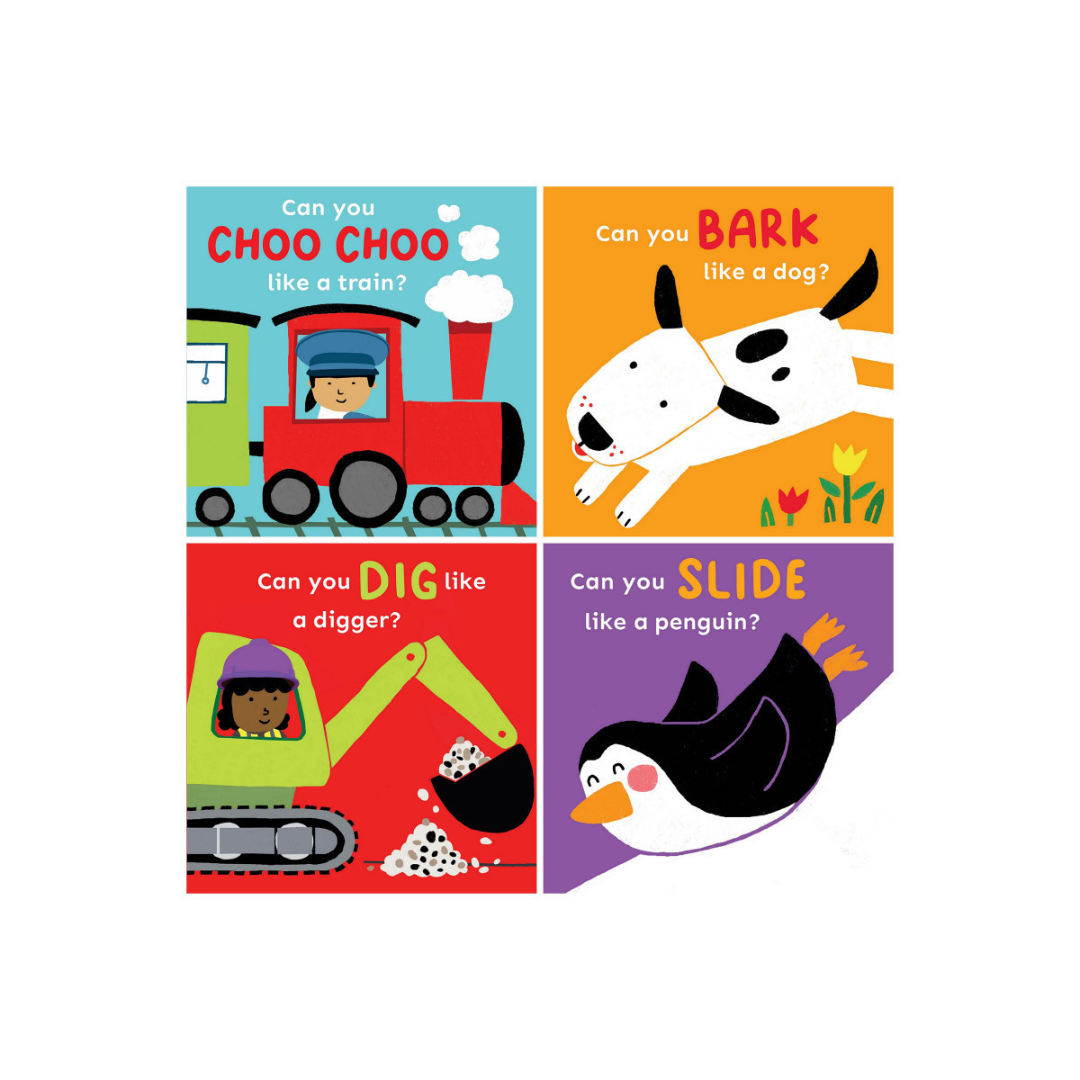 Set of 4 books: Can You Bark Like A Dog?, Can You Choo Choo Like A Train?, Can You Dig Like A Digger?, and Can you Slide Like a Penguin?