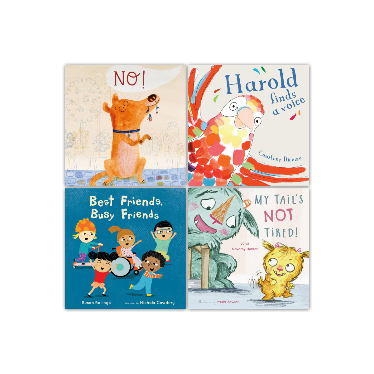 Set of 4 books: NO!, Harold Finds A Voice, My Tail's Not Tired, and Best Friends, Busy Friends.