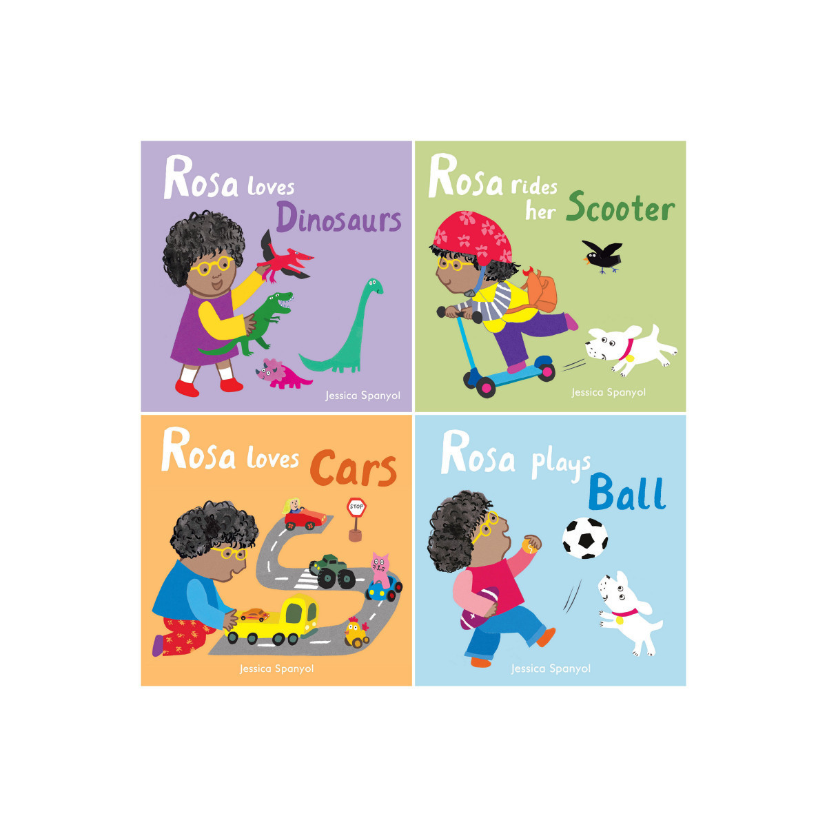 Let's find out which toys Rosa and her friends are playing with today! Rosa makes sure that everyone is happy when they are playing together and sharing. She connects with friends and makes sure that everyone is having fun. An important series that celebrates inclusivity, promotes gender equality and embraces the uniqueness of every child. This set includes 4 titles: Rosa Loves Cars, Rosa Loves Dinosaurs, Rosa Plays Ball, and Rosa Rides her Scooter. Each board book has 12 pages. For ages 1-3.