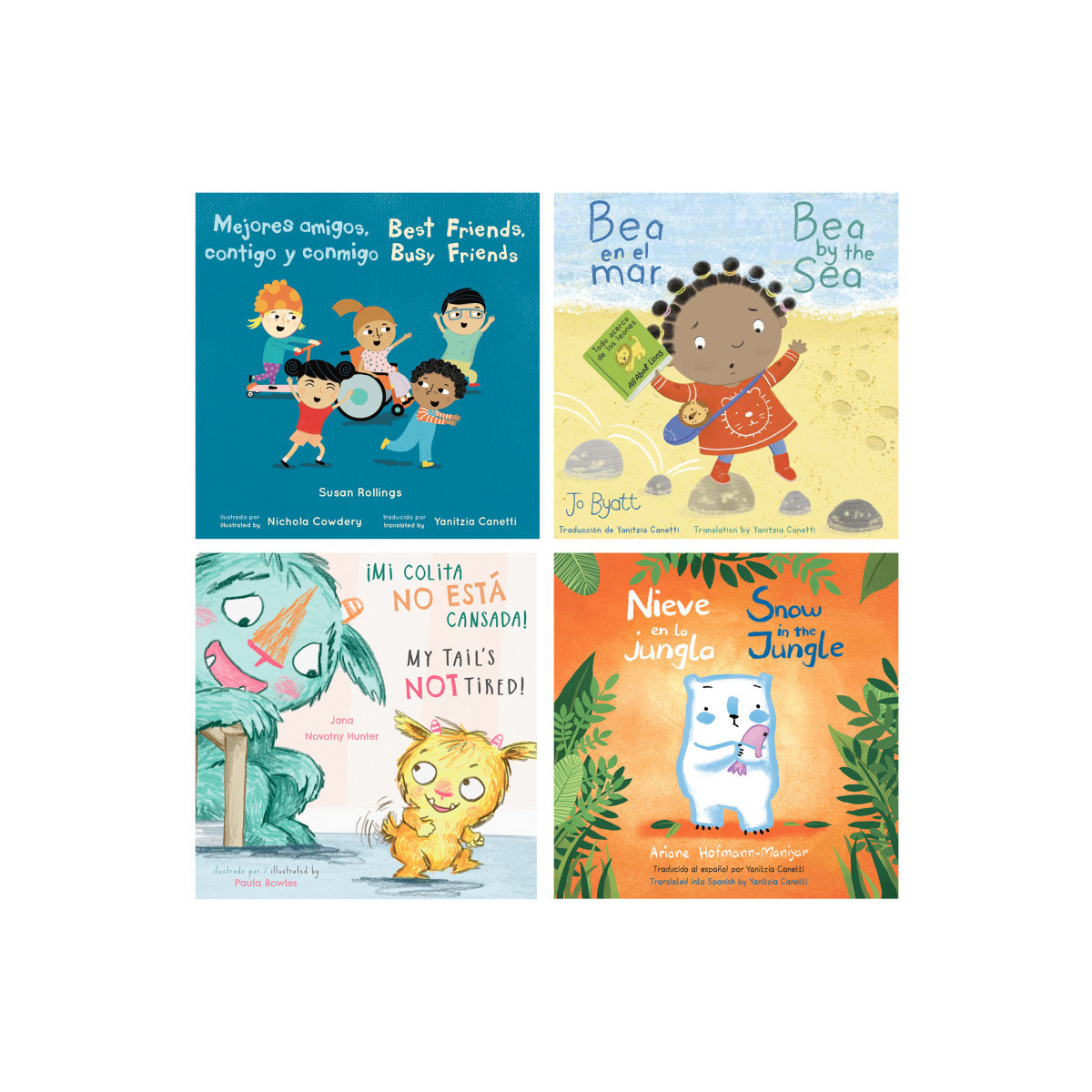 A diverse picture book set in a paperback format, focusing on subjects of anxiety, friendship and the everyday travails of being young. Young children will relate to the characters in each story, as they discover new things about themselves and their abilities to adjust. Great reads for bedtime. Promotes bonding. This set of 4 books includes titles: Best Friends, Busy Friends/ Mejores amigos, contigo y conmigo, Bea by the Sea/ Bea en el Mar, My Tail's Not Tired/ Mi colita No Esta Cansada, and Snow in the Jungle/ Nieve en la jungla.