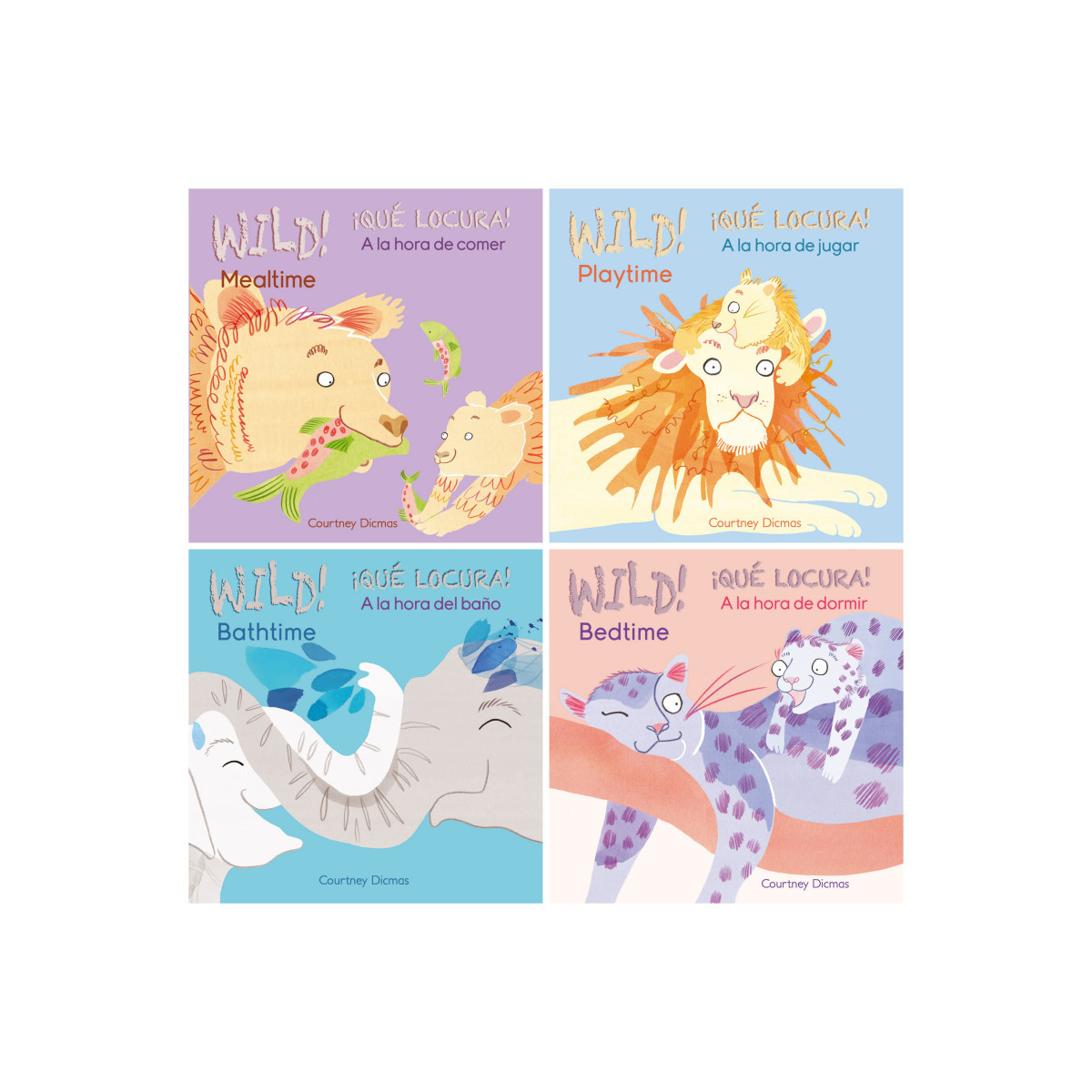 Bedtime can be wild, especially when animal babies are involved. Sometimes messy, always chaotic, and often exhausting, these books offer the perfect opportunity for some quality bonding time! Gentle, colorful and engaging. Courtney Dicmas' wacky style and eye for detail illustrate perfectly the fun, laughter and love that is shared each day in family life. These books are winners! This set includes 4 bilingual titles: Wild! Mealtime, Wild! Bedtime, Wild! Bathtime, Wild! Playtime. Each board book contains 14 pages.