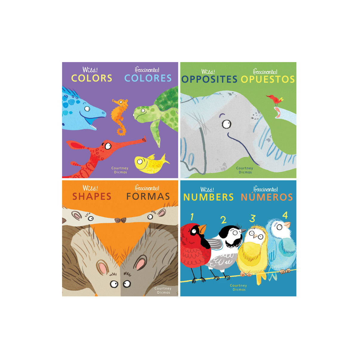 Courtney Dicmas introduces babies to basic concepts with her award-winning charm and humor. In Opposites, interactions between animals with drastically different characteristics provides plenty of opportunities to discuss and make comparisons. Colors takes an original approach to the topic by representing popular colors through ocean creatures. Shapes cleverly demonstrates the way that different shapes appear in nature, through the outlines of animals, or through the negative space between them and their family members. How many birds can roost on a wire? Find out in the final book in the series: Numbers! Each bilingual book has 14 pages.