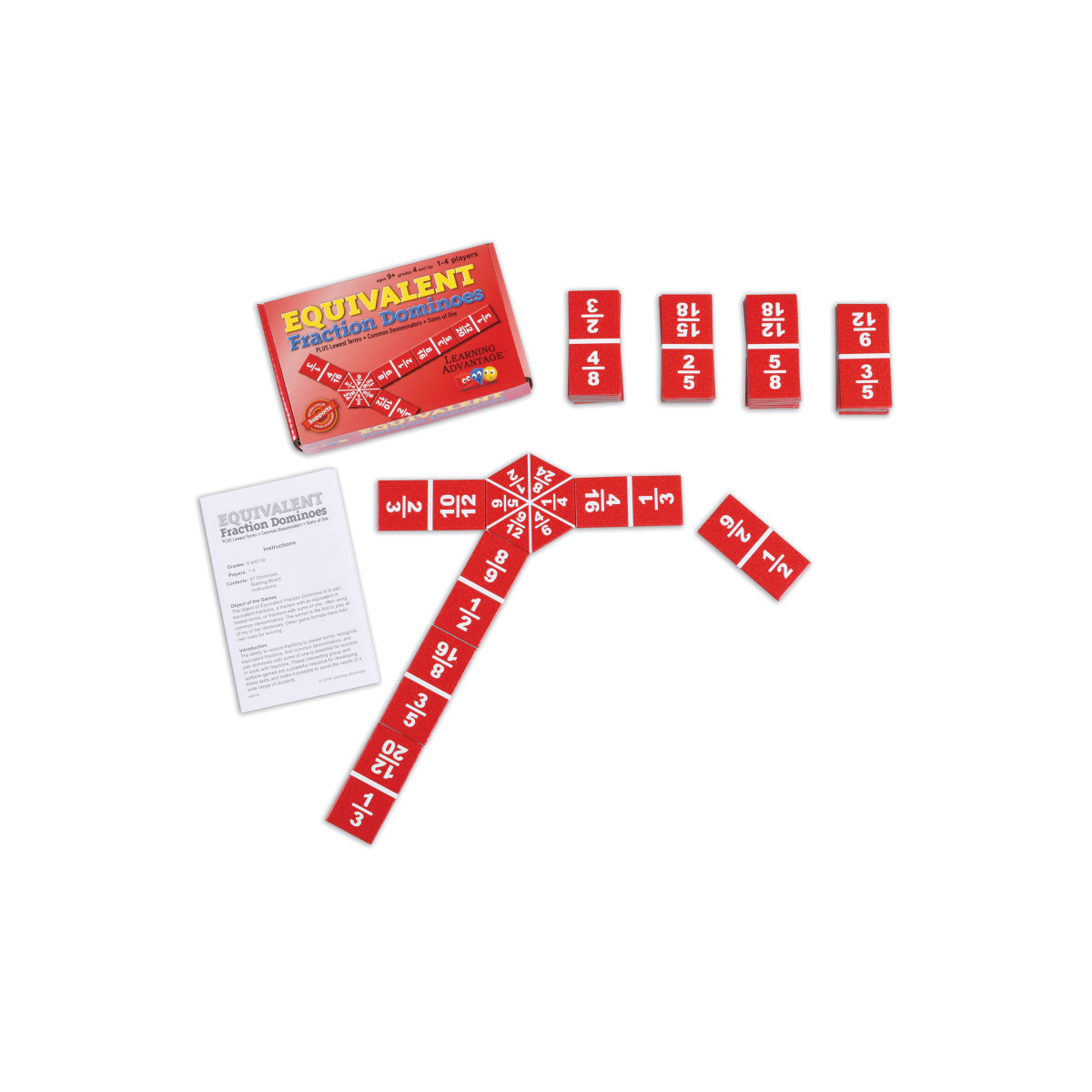 Get a handle on fractions! With these dominoes, players bolster skills in reducing fractions to lowest terms, identifying equivalent fractions, finding common denominators, and pairing fractions with sums of one. The 47 dominoes and hexagonal starting board have fractions with denominators from 2 to 24. Game formats allow for group and solitaire play. Most games are self-checking. For 1-4 players. For grades 4+.