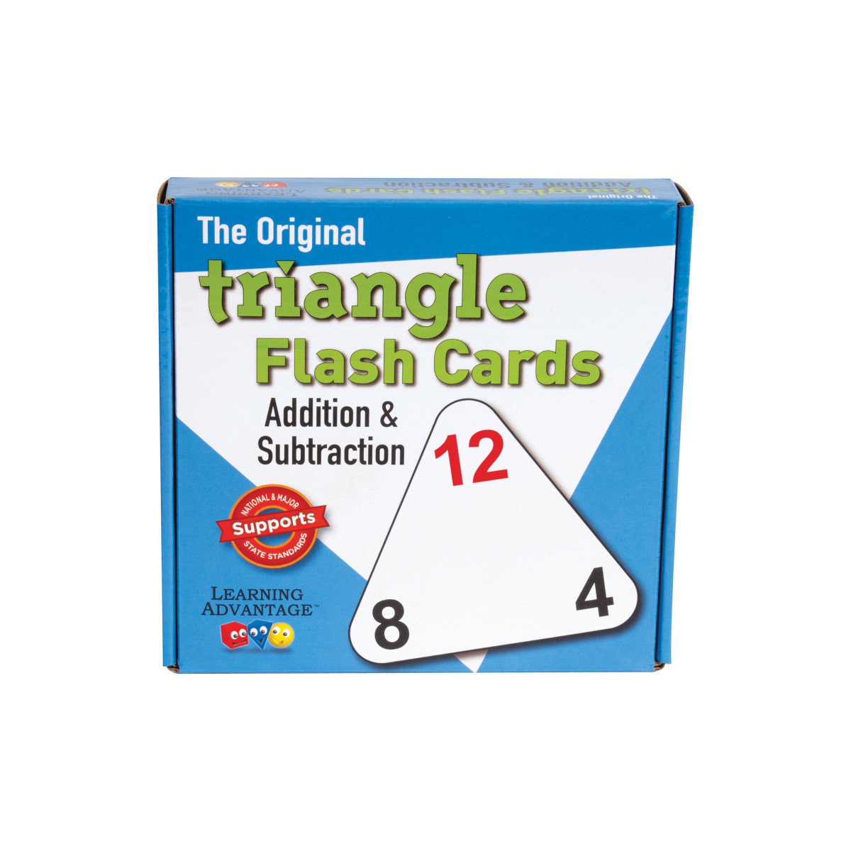 LEARN MATH IN A FLASH -- This set of math flash cards includes 20 double-sided, triangular cards. Use them to help kids, aged 6+, master addition and subtraction while learning families of facts.