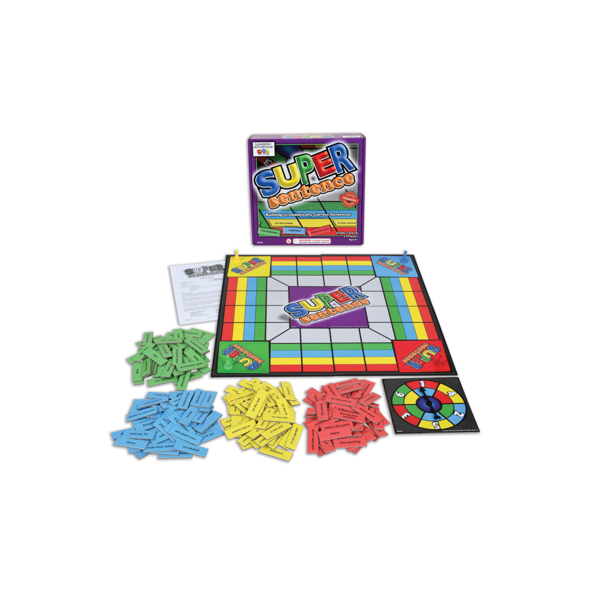 Gather your construction tools—it's time to build sentences! As players spin and move their pawns around the white track, they use who, what, where, and when phrases to build grammatically-correct sentences. Sentences may be silly or serious. The emphasis in on identifying singular and plural subjects, using verbs that agree, and keeping the same tense—past, present, or future—throughout a sentence. The first player to complete five sentences is the winner. Additional suggestions for sorting and writing activities using the tiles are included. For 2-4 players, grades 3 and up. Contents: Game Board with Spinner, Instructions, 200 Who, What, Where, and When Tiles, and 4 Pawns.