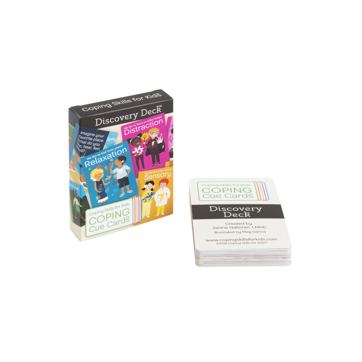 The Coping Cue Cards™ Discovery Deck is a deck of cards designed to help kids learn healthy coping skills. The Discovery Deck has 40 coping skills cards with simple strategies children can use to cope with stress, anxiety, and anger. The deck is sorted into 5 Coping Styles: Relaxation, Distraction, Movement, Processing, and Sensory. There are so many ways to use the Discovery Deck: to help kids identify which coping skills work for them, as a visual reminder to use a coping skill, or as a way to find new coping skills to expand their toolbox. The deck brings order to the mountain of ideas for coping strategies that work for kids.
