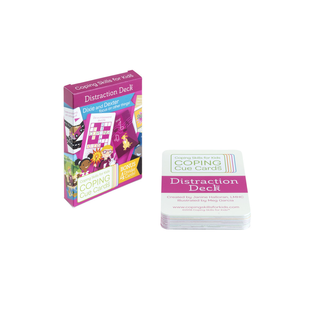 The Coping Cue Cards™ Distraction Deck is a deck of cards designed to help kids learn healthy coping skills. The Distraction Deck has 44 coping skills cards with simple distraction strategies children can use. Play is a natural stress reliever for children, and this deck offers tons of play ideas to help kids decompress. Sometimes kids also need to take a break before they're ready to deal with their stress, anxiety, or anger. This deck offers lots of ideas for creative and fun ways for kids to take a break until they're ready and able to process their thoughts and emotions. We know that not all coping skills work in all places. To make it easier, we've included cheerful divider cards to help you sort skills by different settings like when traveling, at school, at social events, and in stores & restaurants. There are so many ways to use the Distraction Deck: to help kids identify which coping skills they already use and love, as a visual reminder to use a coping skill, or as a way to find new coping skills to expand their toolbox.