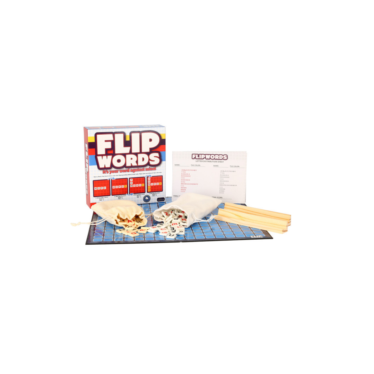 - INCLUDES: Letter tiles with 2 different colored sides, a gameboard, 2 wooden tile racks, Letter sheet pad, and 2 pouches to hold the tiles.