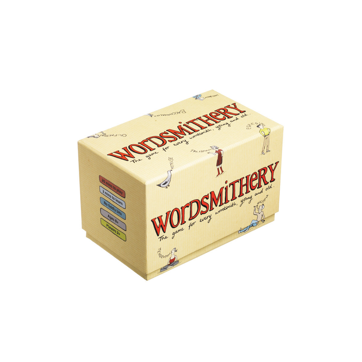 Wordsmithery is dead easy. Take turns to guess the meaning of a word. All 700 of our words are exactly the kind of words that you pretend to understand…when you don't. Words like egregious, phalanx and salubrious. Don't worry. You get three possible – and fun – definitions to choose from. First to ten points wins. Over to you. For 2+ players, ages 7 and up.