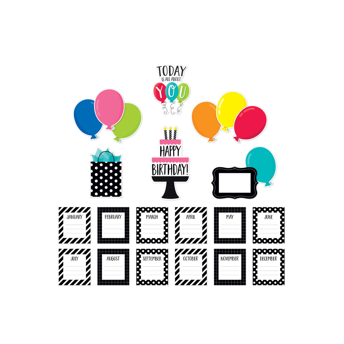 This 23-piece birthday mini bulletin board includes: