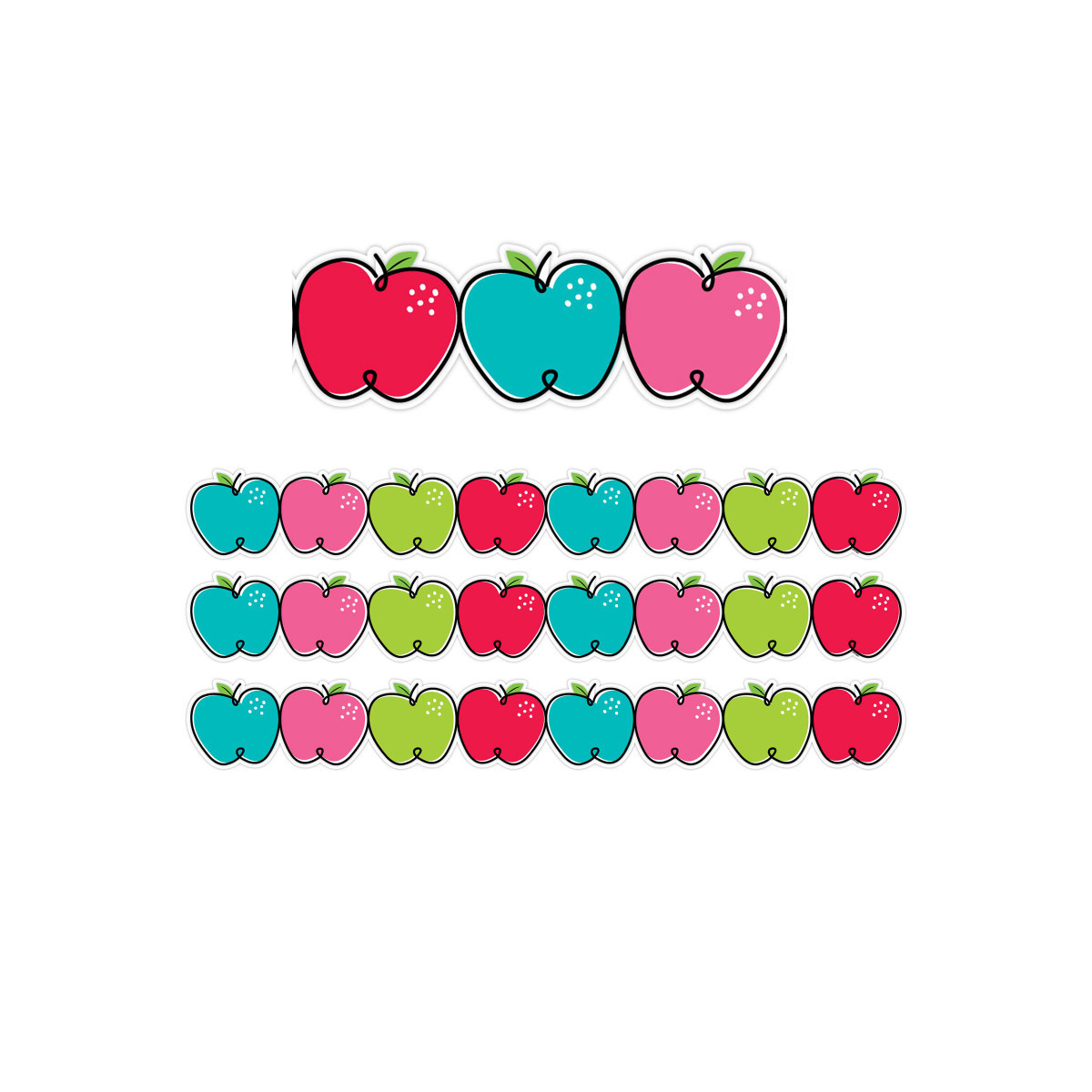 Dress up bulletin boards, rooms, hallways, and common areas with the bright colors and whimsical designs in this Doodle Apples Border. This versatile border is perfect for a variety of bulletin boards and classroom decoration themes. These EZ borders come in smaller strips, which are easier to manage and store. Each pack comes with enough borders to complete 2 full bulletin boards. Strips measure 3" x 24". Each pack includes 24 strips (48 feet). Sold as 3 packs for a total of 72 strips (144 feet).