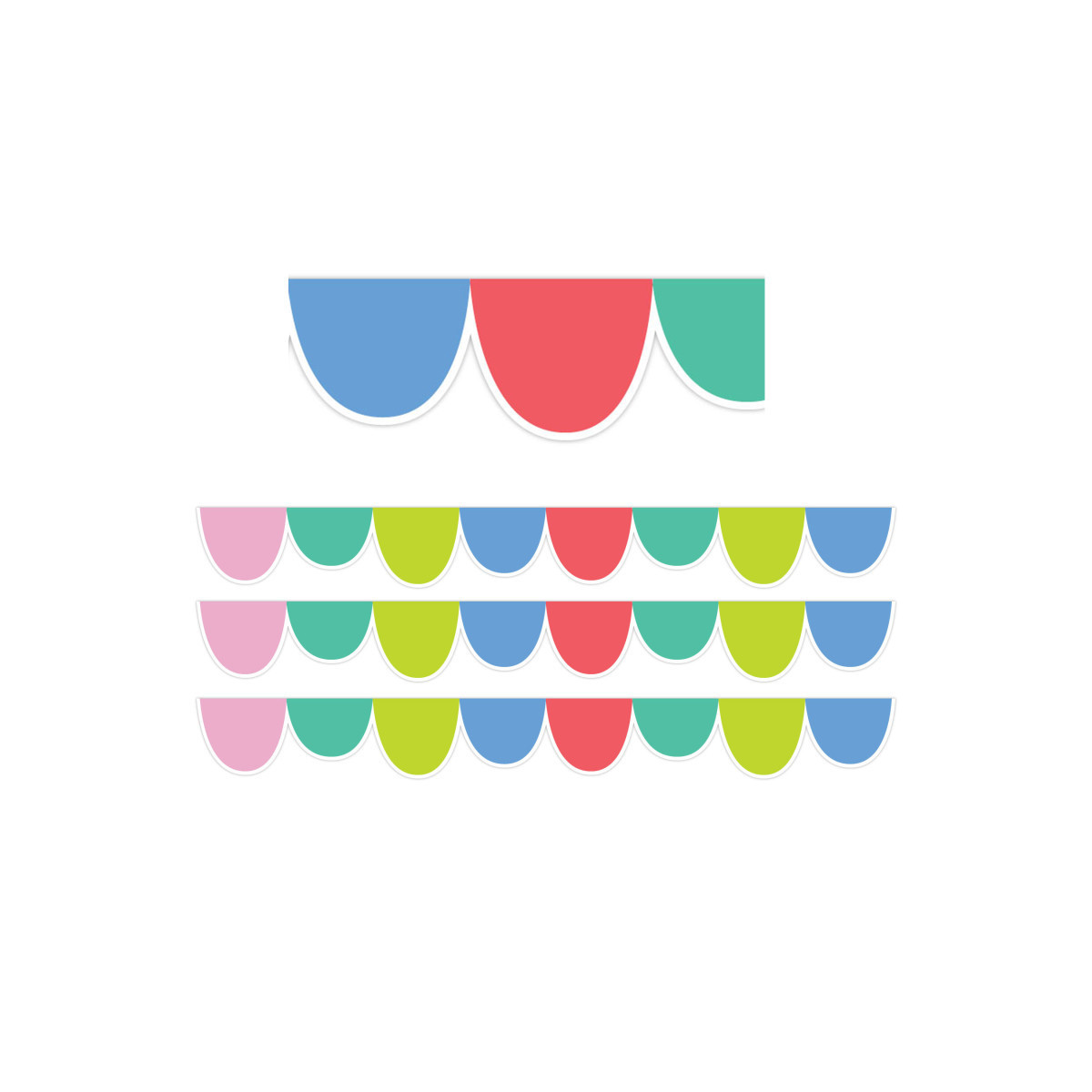 This charming Rainbow Drops Border features a more pastel variety of colors than the classic rainbow. This versatile border is perfect for use in any school setting at any grade level. Also, great for use in a classroom or an office. These EZ borders come in smaller strips, which are easier to manage and store. Each package comes with enough borders to complete 2 full bulletin boards. Measures 3" wide. Each pack includes 24 strips (48 feet) of border. Sold as 3 packs for a total of 72 strips (144 feet) of border.
