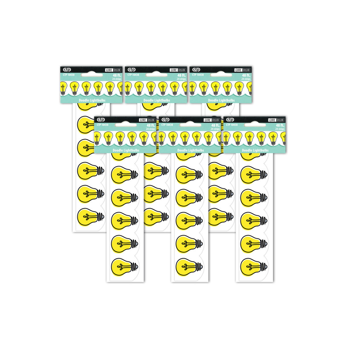 Trim your bulletin boards with this "bright" Doodle Lightbulbs Border. These little lightbulbs are perfect to bring attention and color to bulletin boards highlighting student work, important announcements, or essential content for students to know. Strips measure 3" x 24". Each pack includes 24 strips (48 feet). Sold as 3 packs for a total of 72 strips (144 feet).