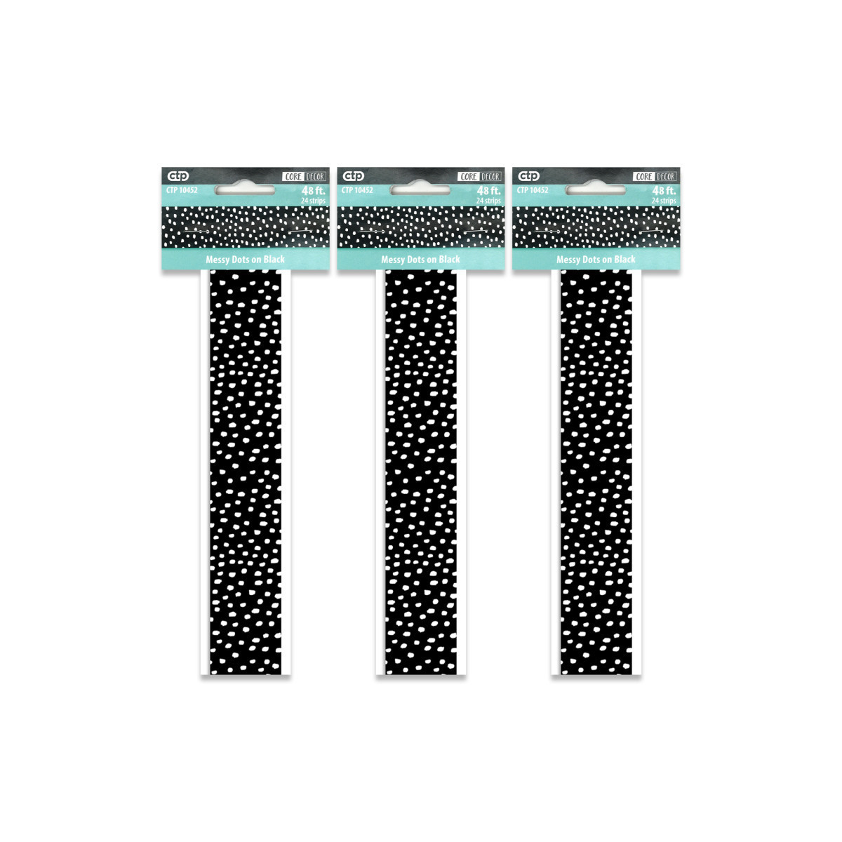 The newest trend in polka dots are messy dots! This Core Decor Messy Dots on Black Border features casual white polka dots on a black background. This is a bold and versatile way to trim any bulletin board or classroom display in any type of school setting at any grade level! Also great for use in an office, a church, a college dorm, or a senior living residence. With its simple design, this bulletin board border can be used alone to create a basic look or layered with another border for a more designer look. These EZ borders come in smaller strips, which are easier to manage and store. Each package comes with enough borders to complete 2 full bulletin boards. Measures 3" wide. Each pack includes 24 strips (48 feet) of border. Sold as 3 packs for a total of 72 strips (144 feet) of border.