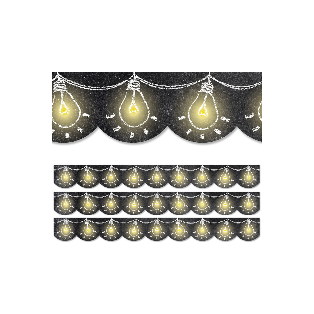 Draw attention to bulletin boards or windows with this unique chalk border! Each lightbulb on this border has a yellow chalk-like glow to "light up" your bulletin board! This black and yellow border is perfect for use on bulletin boards highlighting student work, important announcements, or important content for students to know. These EZ borders come in smaller strips, which are easier to manage and store. Each pack comes with enough borders to complete 2 full bulletin boards. Strips measure 2-3/4" x 24". Each pack includes 24 strips (48 feet). Sold as 3 packs for a total of 72 strips (144 feet).