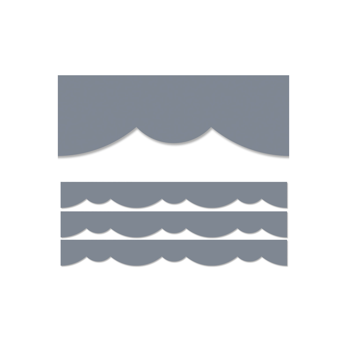 A fun, fresh twist on a solid gray border! This Charcoal Gray Stylish Scallops Border features a playful double scallop design to create a neat and easy way to edge any bulletin board or classroom display. Great for any type of school setting at any grade level! Also great for use on bulletin boards in an office, a church, a college dorm, or a senior living residence. With its versatile scallop design, this bulletin board border can be used alone to create a basic look or layered with another border for a more designer look. These EZ borders come in smaller strips, which are easier to manage and store. Each pack comes with enough borders to complete 2 full bulletin boards. Strips measure 2-3/4" x 24". Each pack includes 24 strips (48 feet).