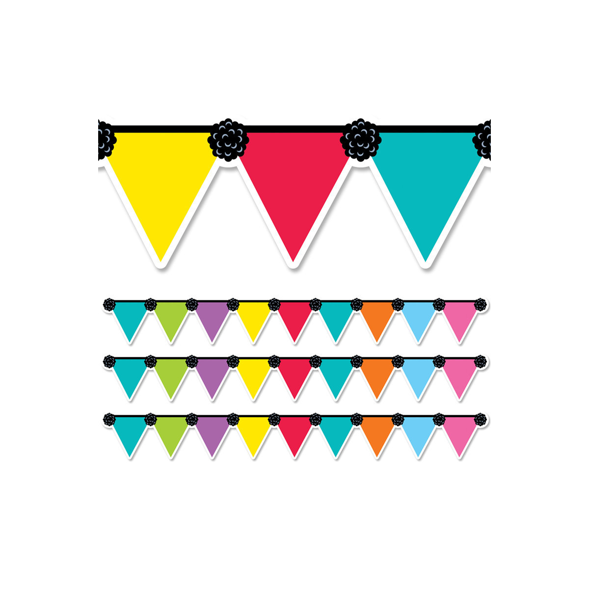 Pennant Party Border depicts a rainbow of colored pennants on a black string with black pom-pom accents