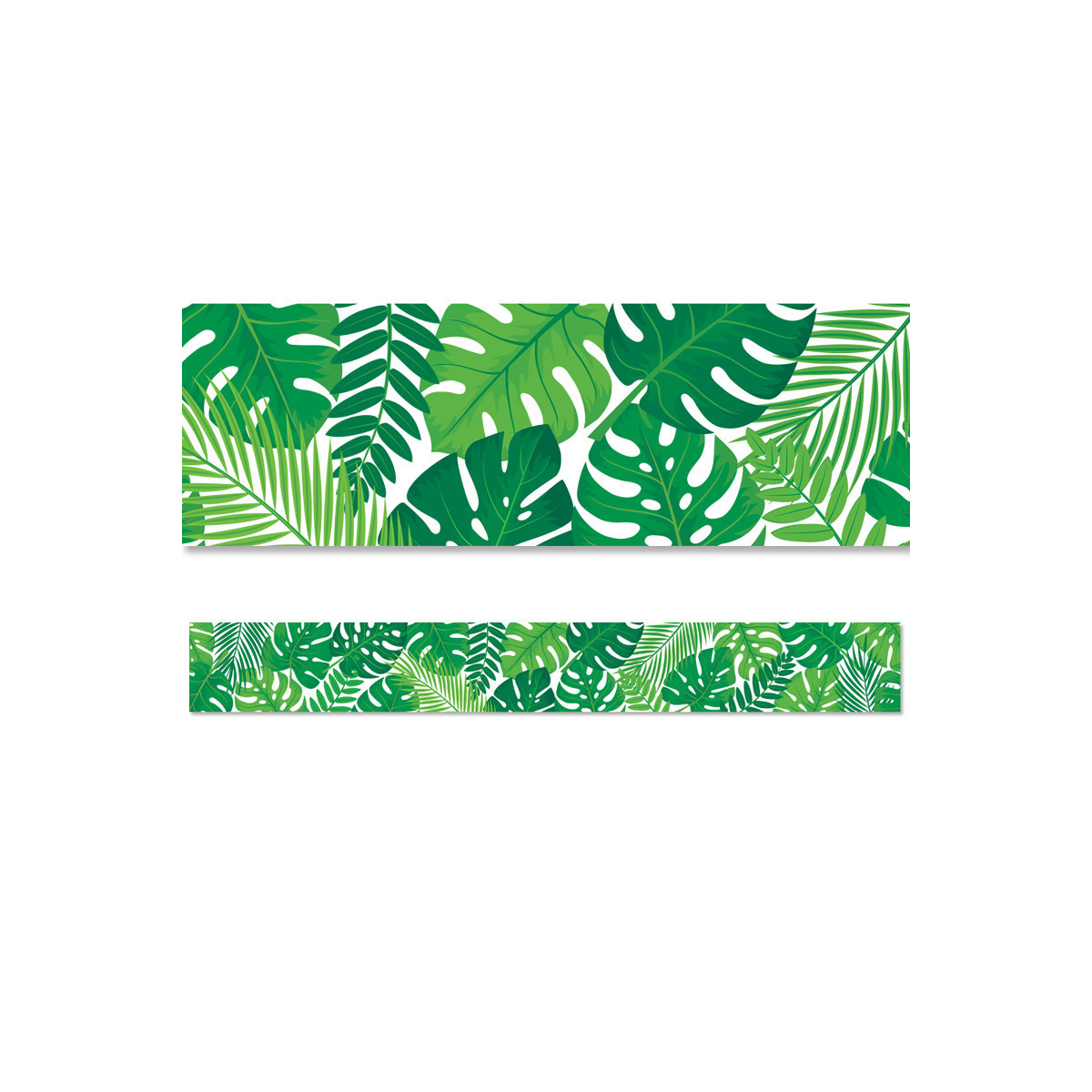 This Palm Paradise Tropical Leaves Border features a mix of lush green monstera and palm leaves. These vibrant leaves will complement a wide variety of bulletin board displays and classroom decoration themes, including those related to science, plants, nature, jungle and zoo. Use this border to trim an inspirational "Unbe-leaf-able Work" or "Be-leaf in yourself" bulletin board. These EZ borders come in smaller strips, which are easier to manage and store. Each pack comes with enough borders to complete 2 full bulletin boards. Strips measure 3" x 24". Each pack includes 24 strips (48 feet).