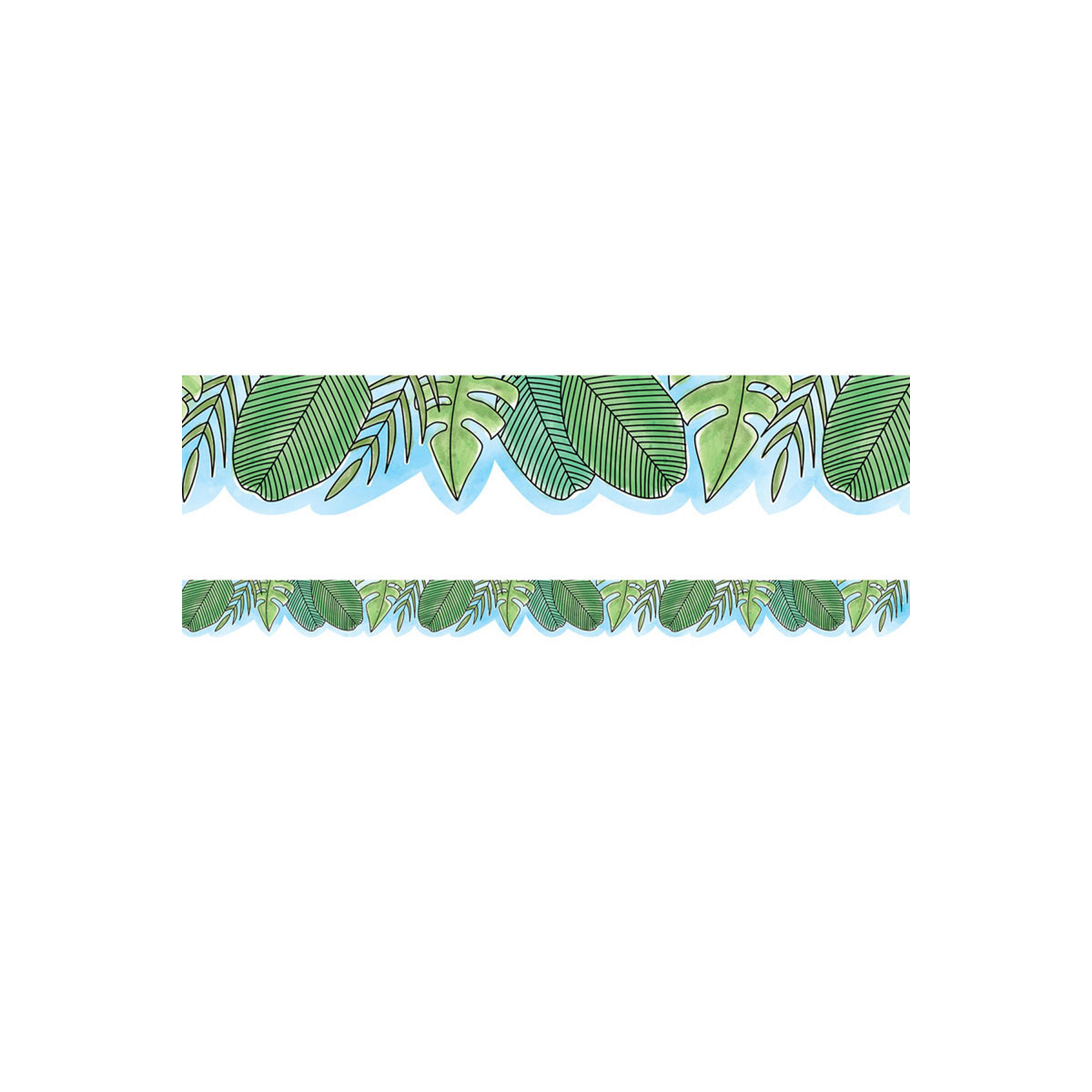 This Jumbo Leaves EZ Border features assorted styles of green safari leaves with a light blue sky background. These colorful leaves will complement a wide variety of bulletin board displays and classroom decoration themes, including those related to animals, science, plants, nature, jungle, zoo, and more. These EZ borders come in smaller strips, which are easier to manage and store. Each package comes with enough borders to complete 2 full bulletin boards. Each pack includes 24 strips, each measuring 2-3/4" x 24", for a total of 48 feet per pack.