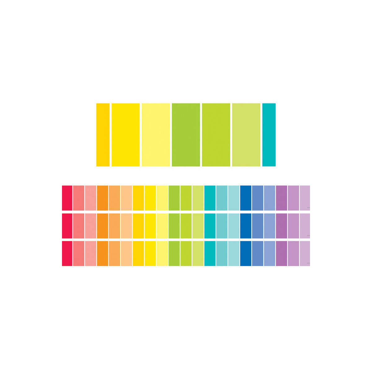 Layer multiple borders to create a special pop in your classroom with this Rainbow Paint Chip EZ Border. These EZ borders come in smaller strips, which are easier to manage and store. Each package comes with Each pack includes enough borders to complete 2 full bulletin boards. Each pack includes 24 strips, each measuring 3" x 24", for a total of 48 feet per pack. Sold as 3 packs for a total of 72 strips (144 feet).