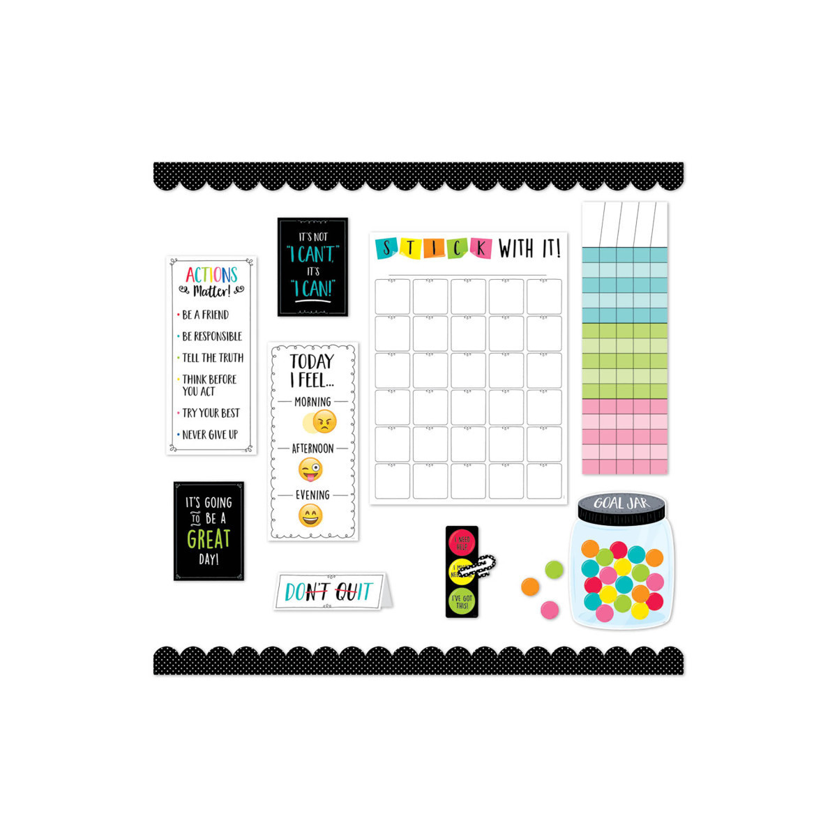 • Charts: 1 color-coded incentive chart (7 1/2"w x 24"); 1 feelings chart (8"w x 17 1/2"h) with 21 emoji face pieces (2"w x 2"h); 1 Stick with It! Chart (17 1/2"w x 24"h); 1 Goal Jar (9 1/2"w x 12"h )
