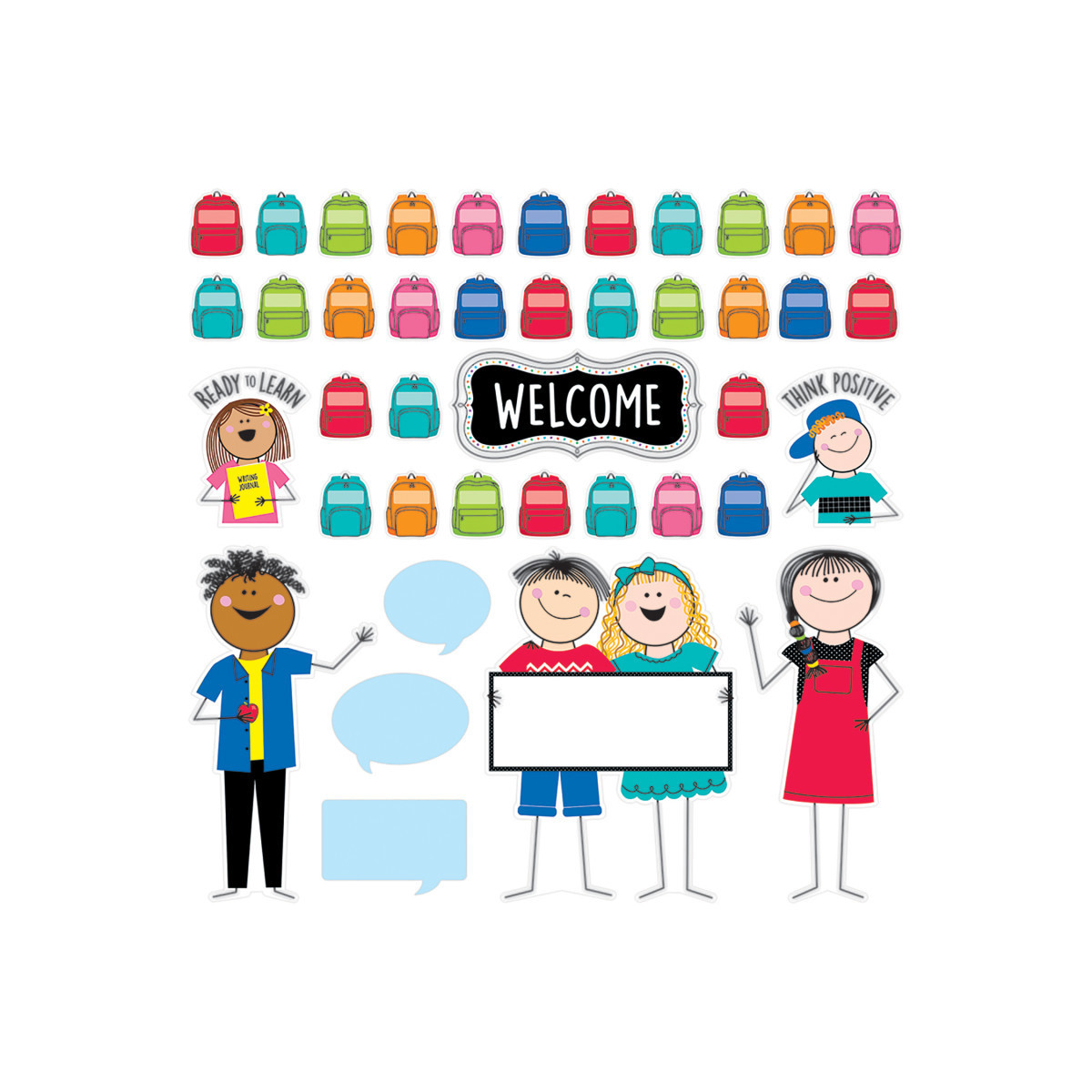 This All Are Welcome Bulletin Board is designed to set an inclusive tone wherever it's displayed. The set features Stick Kids representing diverse backgrounds and includes a colorful array of backpacks that can be personalized for the members of your class or group.