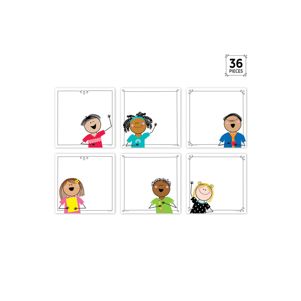 Add a touch of diversity to your learning displays and activities with these Stick Kids 6" Designer Cut-Outs! These cut-outs are perfect for class messages, writing assignments, learning center activities, accenting bulletin boards, and more! Use them to give special recognition for a job well done or to write a positive note to a student or parent. The cut-outs can also be used to make quick and easy labels on cubbies, student folders, supply bins and binders. Each pack includes 36 pieces, 6 each of 6 designs.