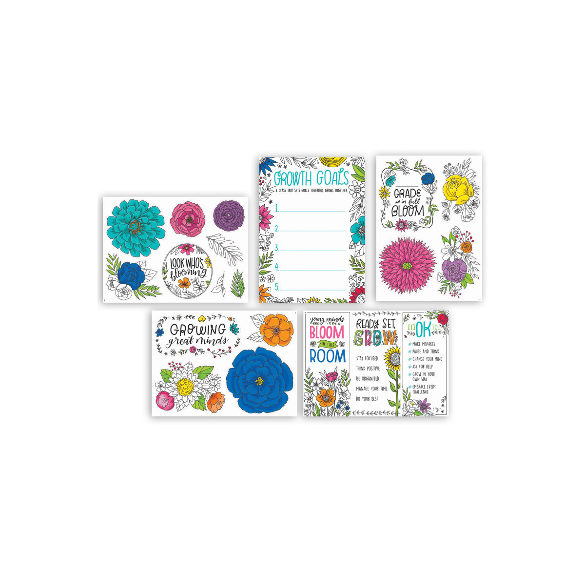 Growing great minds is the theme of this Blooming Minds Bulletin Board. Pieces offer encouraging tips for student success and a place for recording class goals. The fresh, casual design features flowers in slightly pastel colors popping on a white background, perfect for brightening any space.