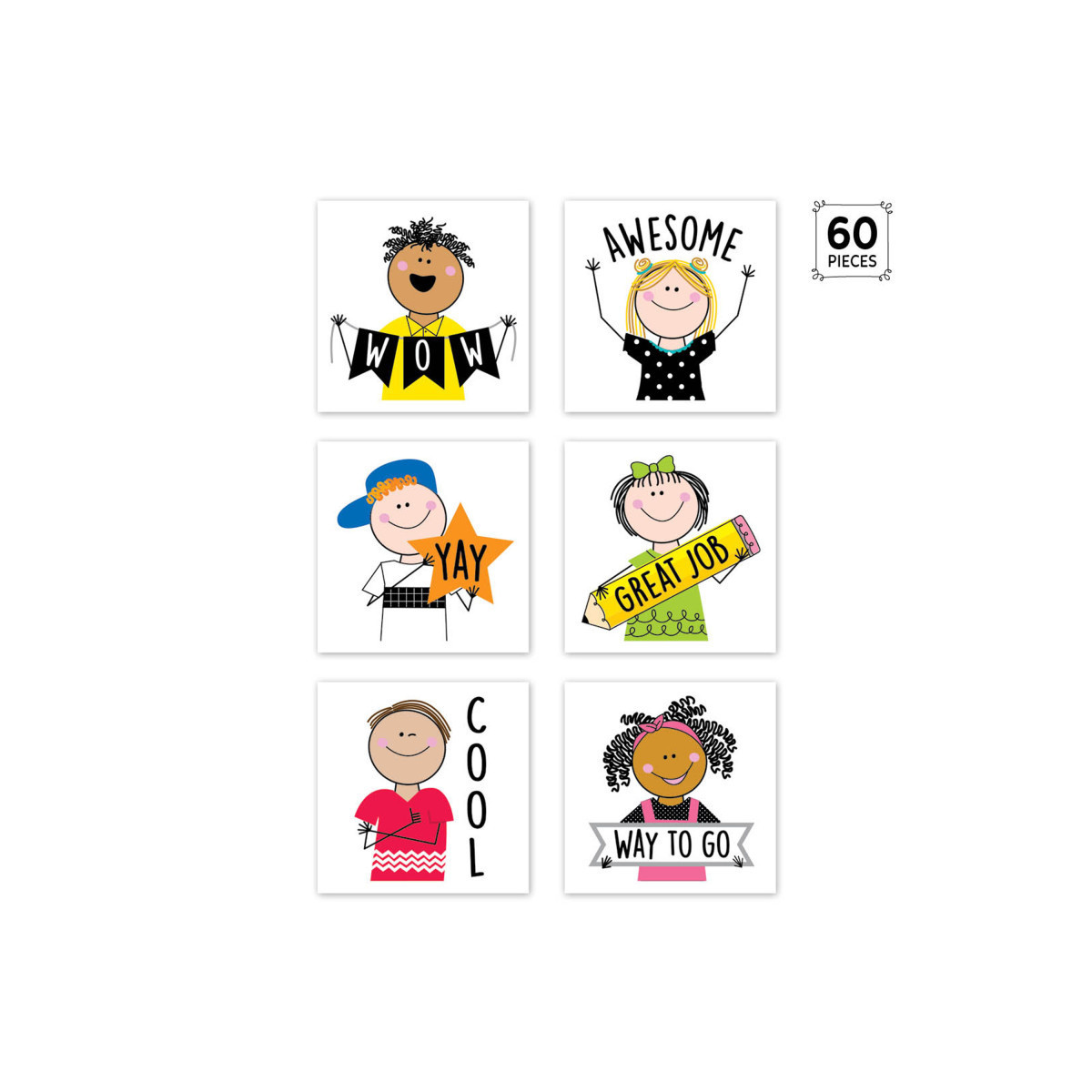 Recognize students for outstanding work, good behavior, and a positive attitude with these Stick Kids Rewards Stickers. The bright colors and positive sayings will encourage students to work hard and behave well all year long. Approximately 1.5" x 1.5". Each pack includes 60 acid-free stickers.