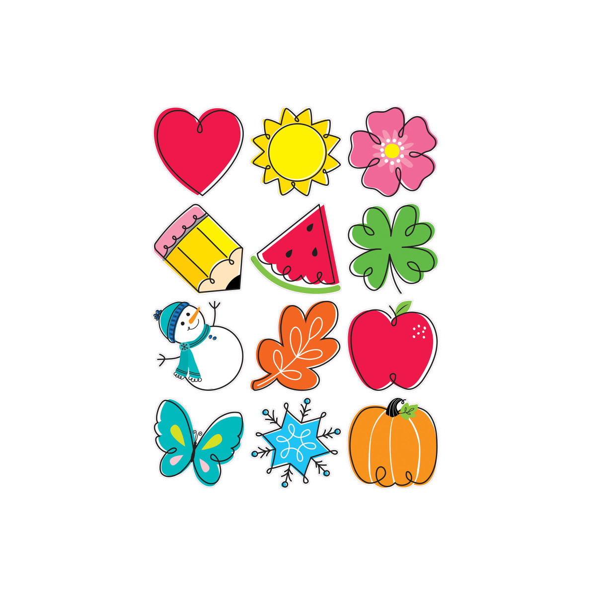 Adapting your wall display to fit the season is a snap with these Seasonal Accents 10" Designer Cut-Outs. The whimsical Doodle design of these 12 big cut-outs represent decorations for fall, winter, spring, and summer, as well as holiday decorations for Valentine's Day, St. Patrick's Day, Halloween, and Christmas.