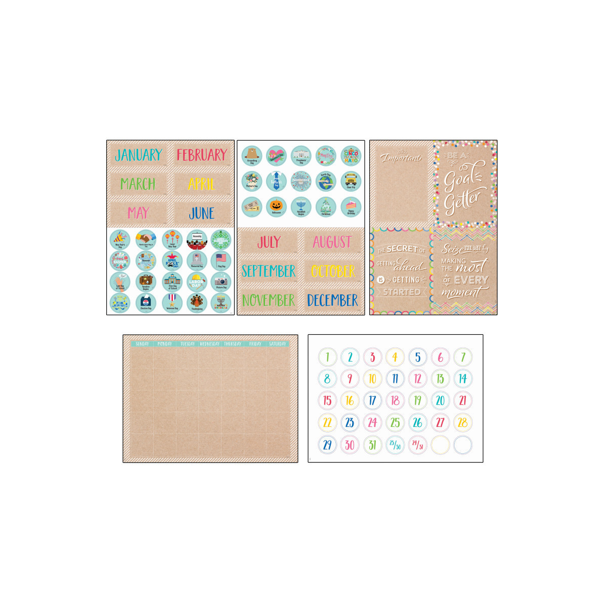 This 87-piece set includes a calendar chart, 12 month headlines, 31 pre-numbered calendar days, 23/30, 24/31, and 2 blank calendar days, 35 coordinating holiday and special day cards, and 4 motivational mini posters.